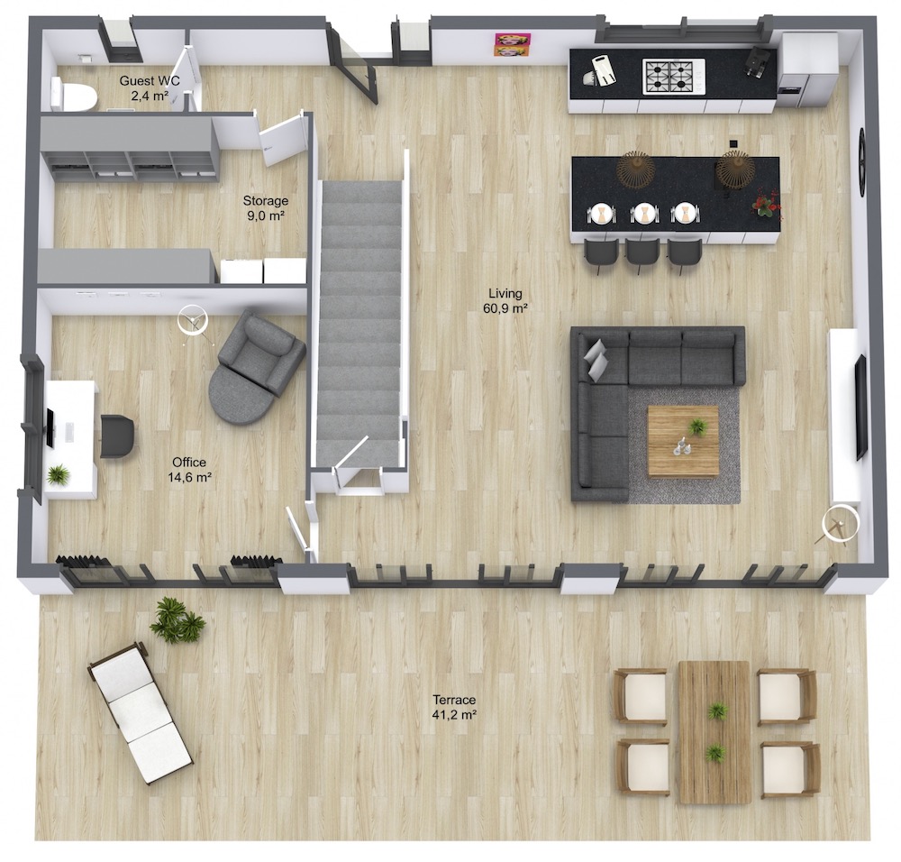 the 4th bedroom on the ground floor can also be used as an office space – connected with a sliding glas door to the terrace and has one more window on the other side, creating a beautiful, bright and motivating atmosphere.